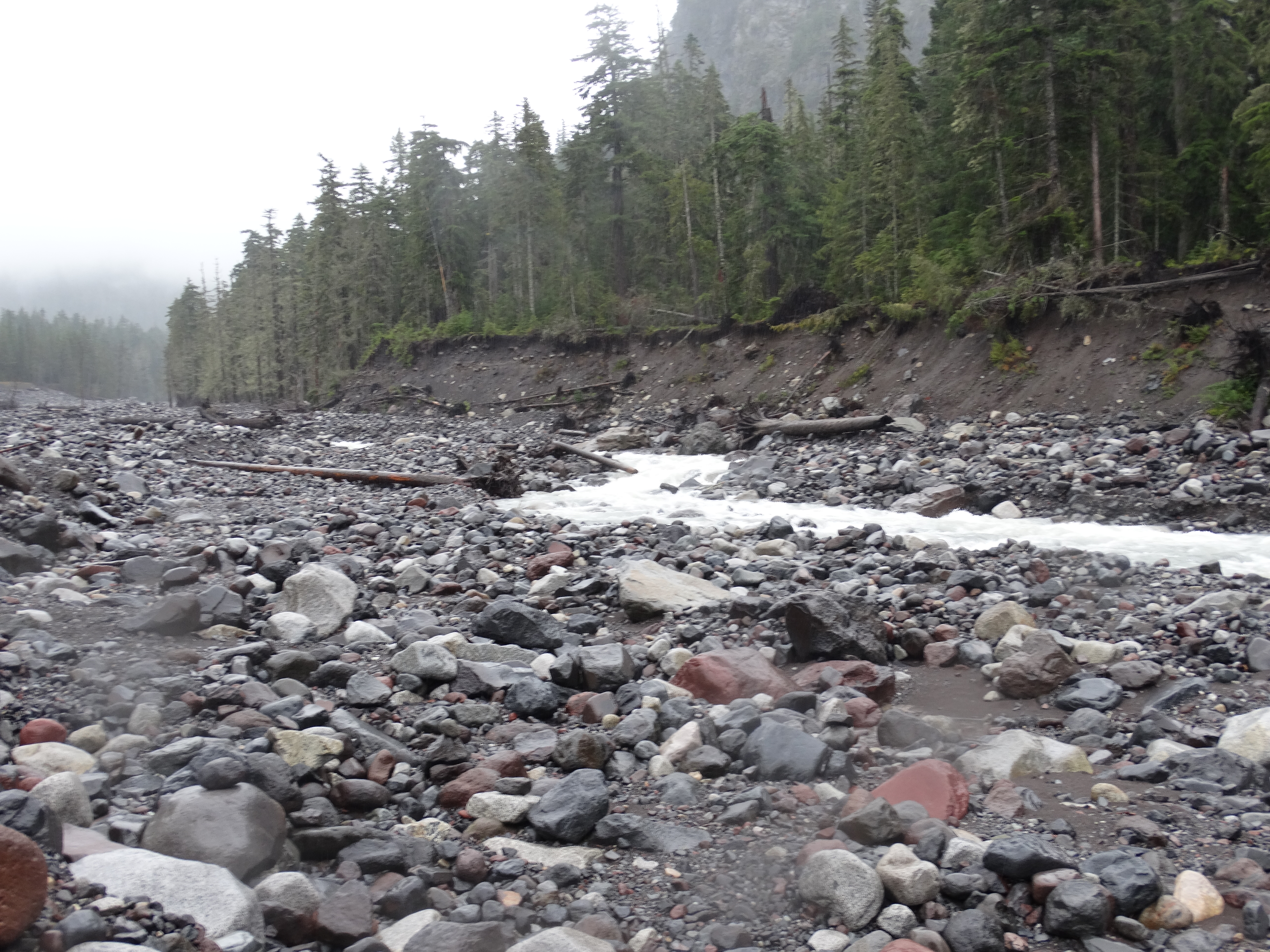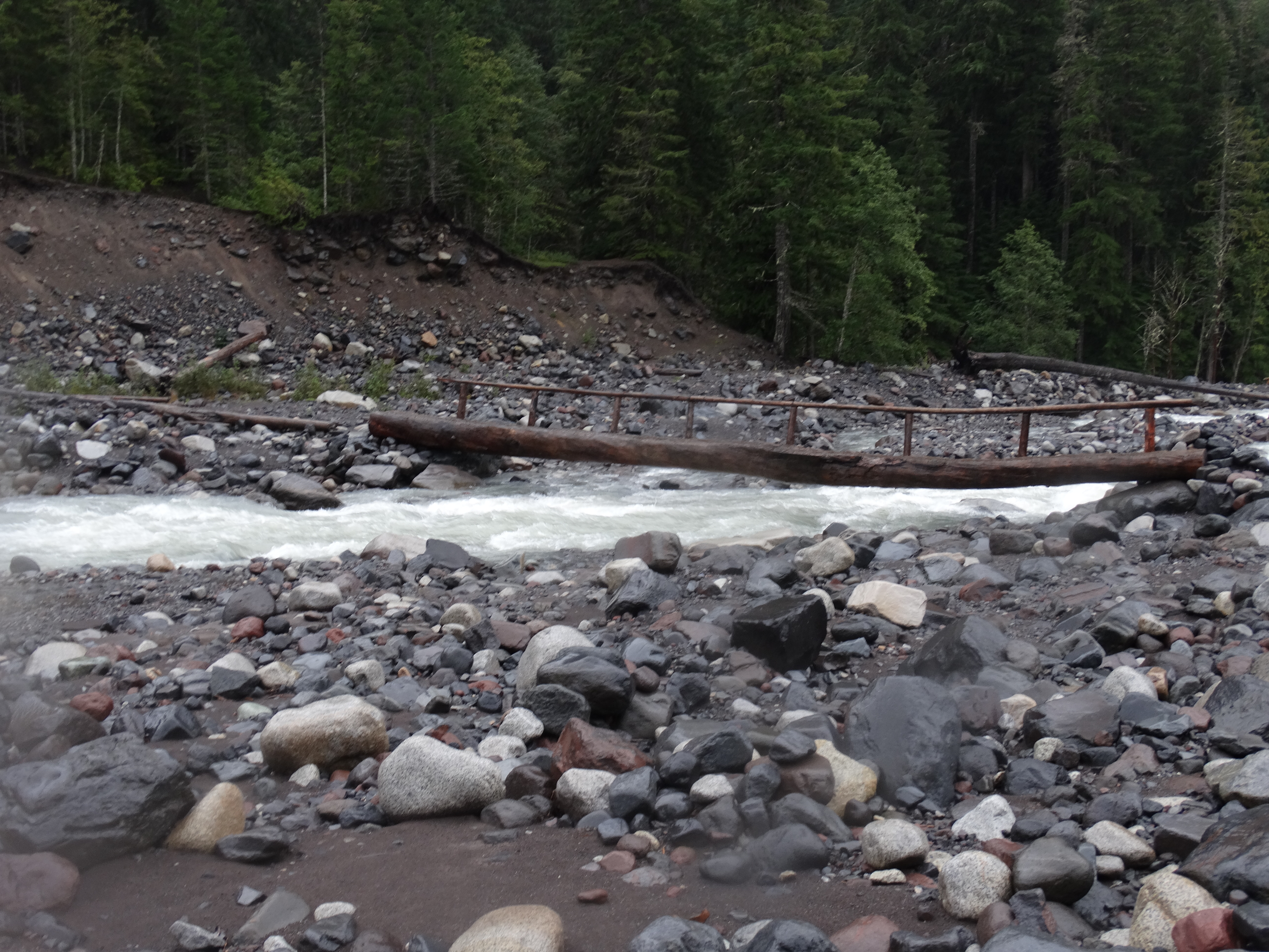 The hike starts by crossing the Nisqually riverbed; including walking across a log bridge- kids should have an adult cross with them to be safe. The cliffs across the river are spotted with long, graceful waterfalls, and if there are no clouds, Mt. Rainier can be seen looking up the river. Once you are on the other side of the river you head up into the trees and start making your way to the falls, with the river on your right. It is an uphill hike, but not a steep one.