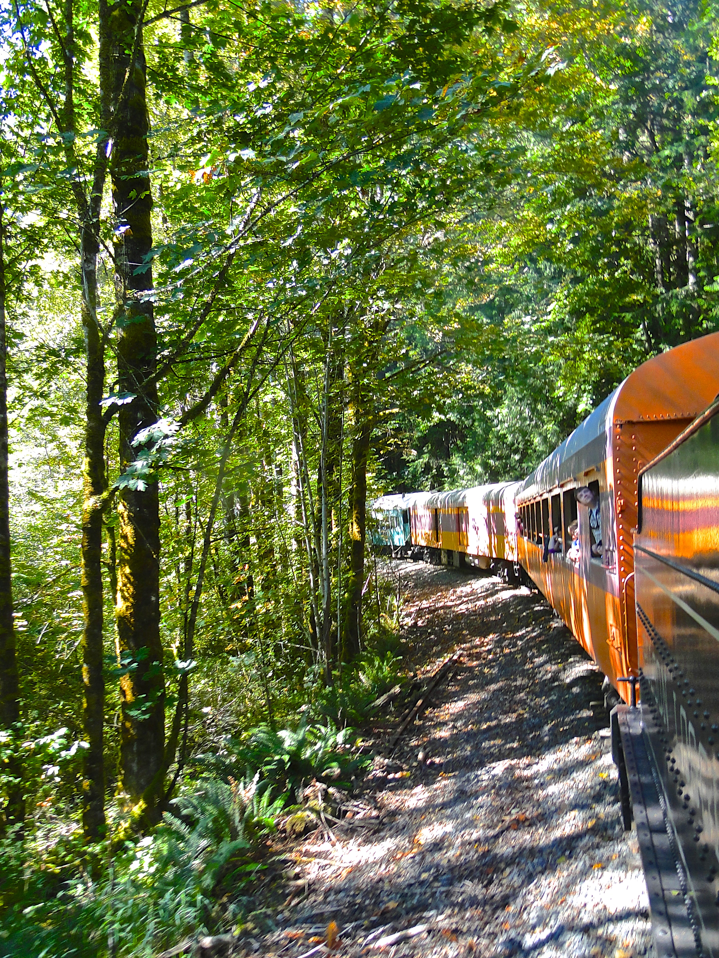 Continuing on the adventure, the train will cross back across the high way and across a bridge over the Nisqually River. On a clear day you can look upriver to enjoy the grandeur of the river’s source – Mt. Rainier. The mountain will show her face a bit throughout the latter half of the ride, peaking above the hills and adding another dimension to the scenes of changing leaves, flowing rivers, and forested hillsides.